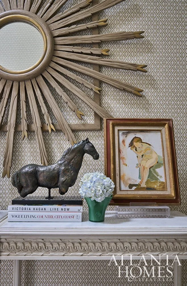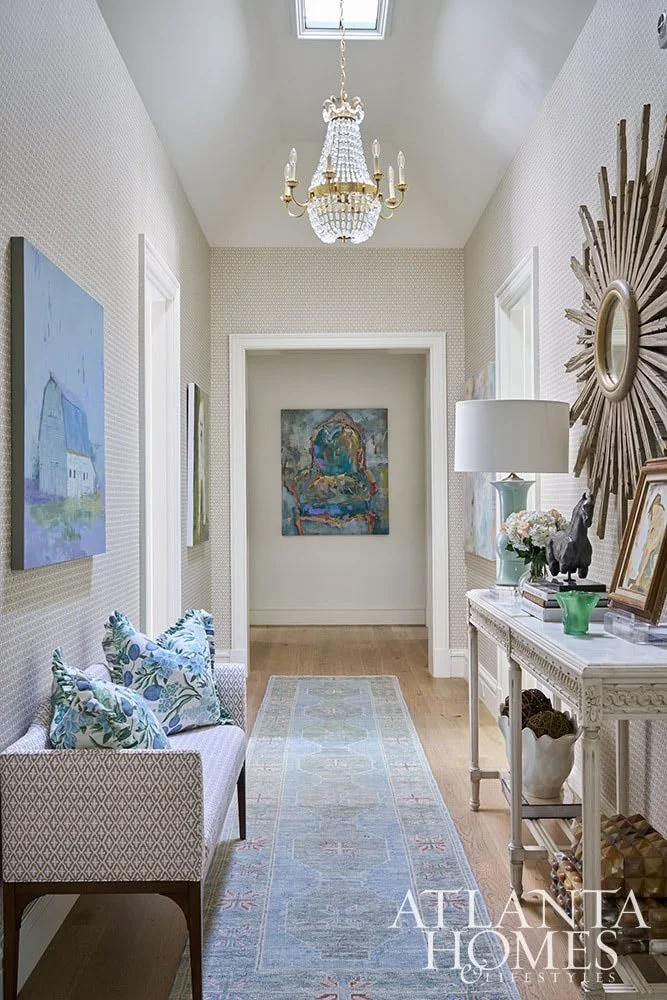 Unlike many passageways whose design has been ignored, this upstairs hallway benefits from thoughtful curation. “I approached designing this hallway as a fun opportunity to blend functionality and style,” says its designer, Courtney Walker. Patterned wallpaper in neutral hues creates a subtle-yet-spirited backdrop for an array of enticing furnishings. Wide enough to accommodate a settee whose upholstery matches the wallpaper, the hallway also houses a slim carved console table accessorized with a ceramic lamp, books, artwork, and a collection of horn boxes. An unusual sunburst mirror made of wood hangs above it. Large, colorful paintings, including one placed at the end of the hall, provide additional character. “I chose art that added vibrant pops of color and that complements the hallway’s color scheme,” explains Walker. A crystal chandelier serves as a crowning touch. Down below, a runner in subtle shades of blue and green unifies the space. —Jennifer Boles